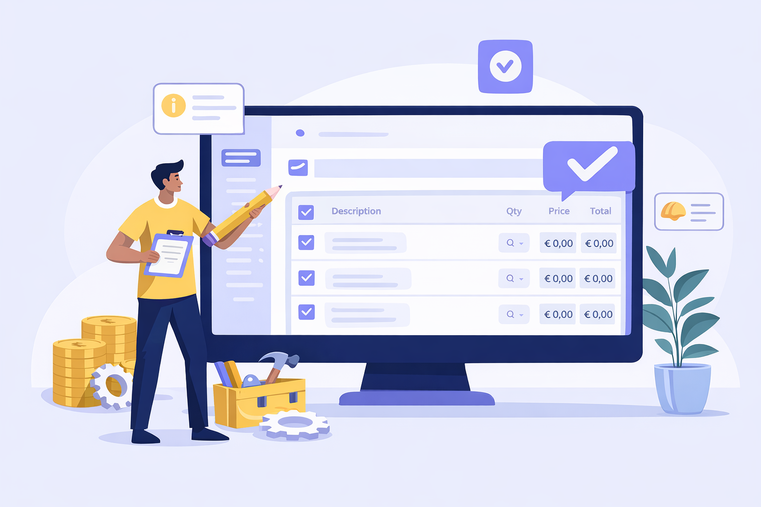 Totaux, TVA, quantités — tout se calcule sans erreur - générez des devis PDF professionnels en un clic..